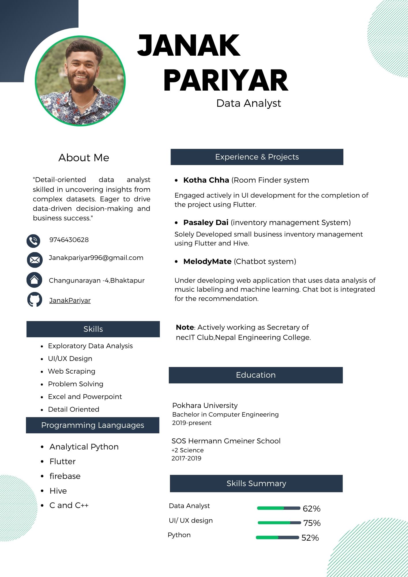 I possess a keen eye for detail and a methodical approach to data analysis, ensuring accuracy and reliability in my work. My proficiency in various analytical tools and programming languages, including Python, Flutter, and SQL, allows me to efficiently handle large datasets and perform advanced analytics. I am eager to collaborate with cross-functional teams and contribute to impactful projects that enhance business performance and innovation.